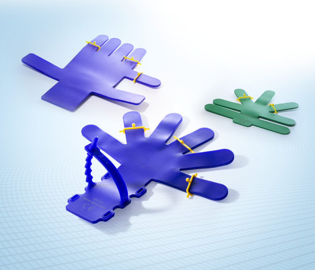 This malleable x-ray tranlucent support, made of an alloy in special condition and a soft silicon coating, maintains the hand in position during surgery without any additional help. It is available in three configurations : large, medium (for adults) and small for paediatric use.